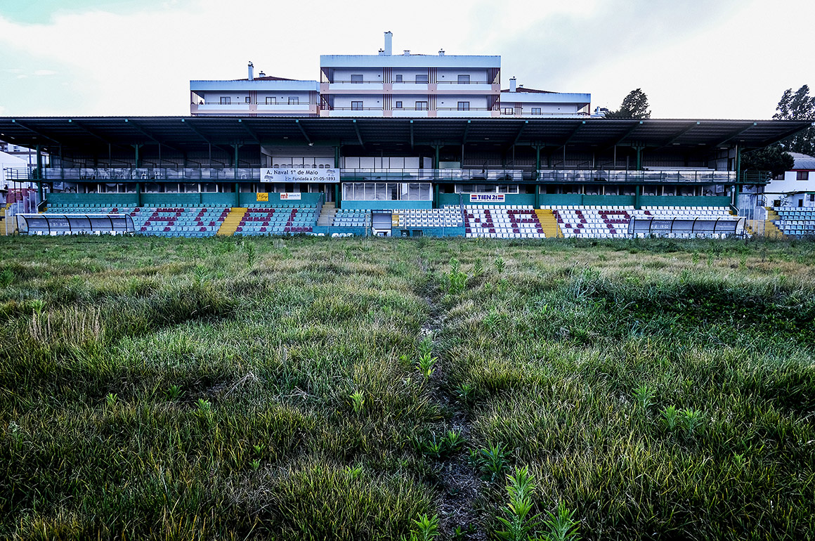 O estádio municipal transporta-nos para um cenário de guerra. O relvado com quase 40 anos assumiu uma existência errante, selvagem, alvo fácil de chacota nas redes sociais, acossado por drones e câmaras indiscretas que captam imagens degradantes. A vegetação apoderou-se do recinto que, não há muito tempo, acolhia 9000 adeptos. As bancadas amovíveis apodreceram, o ferro e as cadeiras foram reconvertidos em trocos que nem para comprar bolas chegam. Os torniquetes aguardam estoicamente, já sem a companhia dos eucaliptos entretanto expulsos. As torres de iluminação repousam sobre poços de água. E, mesmo sem utilização, obrigam a Naval a pagar uma taxa de 2000 euros mensais. Qualquer incumprimento leva ao corte de energia, o que não seria inédito. Aconteceu, aliás, na véspera do último Natal, deixando os jogadores “residentes” da formação sem electricidade durante nada menos do que uma semana.